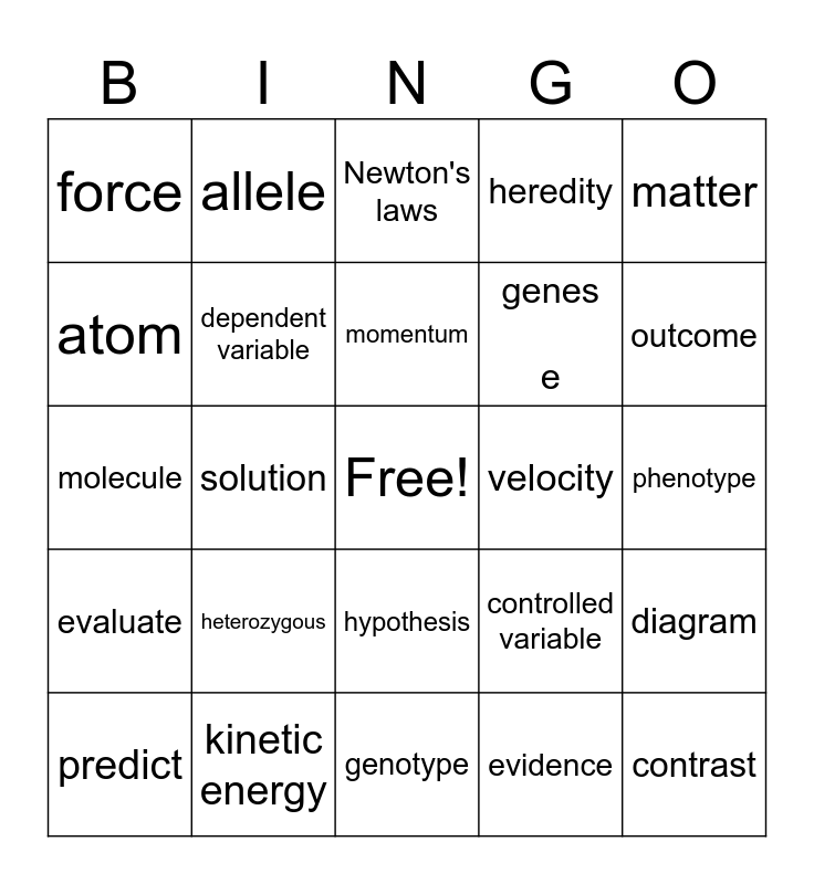 This bingo card has a free space and 35 words: nucleus, Punnett square, independent variable, dependent variable, hypothesis, heredity, atom, acceleration, momentum, eclipse, molecule, matter, energy, work, force, velocity, evidence, solution, evaluate, contrast, controlled variable, predict, diagram, kinetic energy, Newton's laws, outcome, homeostasis, theory, genes e, phenotype, mutation, genotype, heterozygous, allele and homozygous.
