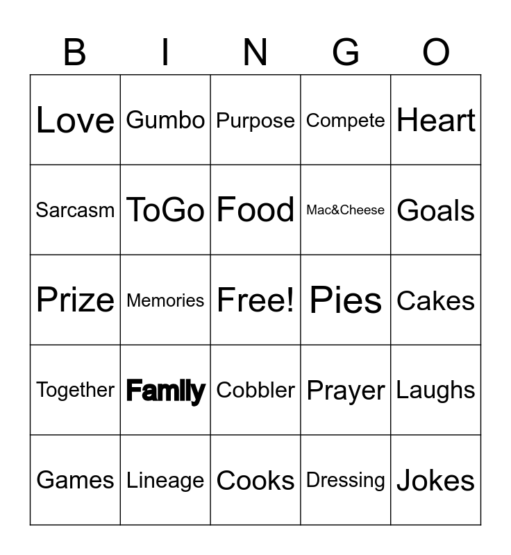 This bingo card has a free space and 24 words: Family, Lineage, Food, Games, Heart, Love, Sarcasm, Gumbo, Pies, Cobbler, Mac&Cheese, Prize, Prayer, Laughs, ToGo, Dressing, Cakes, Purpose, Goals, Memories, Jokes, Together, Compete and Cooks.