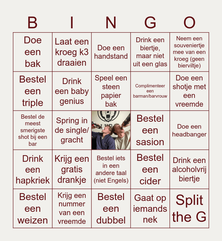 This bingo card has a free space and 32 words: Gaat op iemands nek, Zing een liedje acapella, Spring in de single/ gracht, Drink mix twee biertjes, Drink een hapkriek, Drink een baby genius, Neem een souveniertje mee van een kroeg (geen bierviltje), Drink een alcoholvrij biertje, Laat een kroeg k3 draaien, Vind een looklike van een collega, Speel een steen papier bak, Doe een handstand, Bestel een quadrupel, Spot iemand met een gekke outfit, Bestel een sasion, Foto met vreemde, Bestel een weizen, Bestel de meest smerigste shot bij een bar, Bestel iets in een andere taal (niet Engels), Krijg een gratis drankje, Bestel een cider, Drink zonder je handen te gebruiken, Doe een headbanger, Krijg een nummer van een vreemde, Split the G, Drink een biertje, maar niet uit een glas, Complimenteer een barman/barvrouw, Bestel een triple, Doe een bak, Bestel een dubbel, Tap een biertje achter een bar and Doe een shotje met een vreemde.