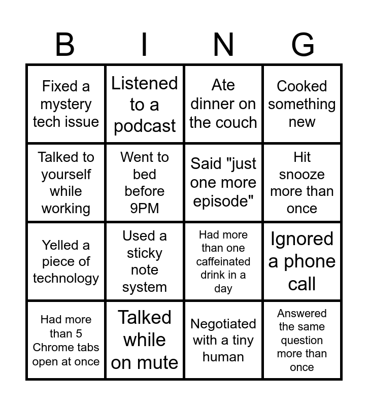 This bingo card has 16 words: Talked while on mute, Ignored a phone call, Ate dinner on the couch, Fixed a mystery tech issue, Yelled a piece of technology, Listened to a podcast, Had more than one caffeinated drink in a day, Negotiated with a tiny human, Talked to yourself while working, Went to bed before 9PM, Had more than 5 Chrome tabs open at once, Cooked something new, Used a sticky note system, Hit snooze more than once, Said "just one more episode" and Answered the same question more than once.