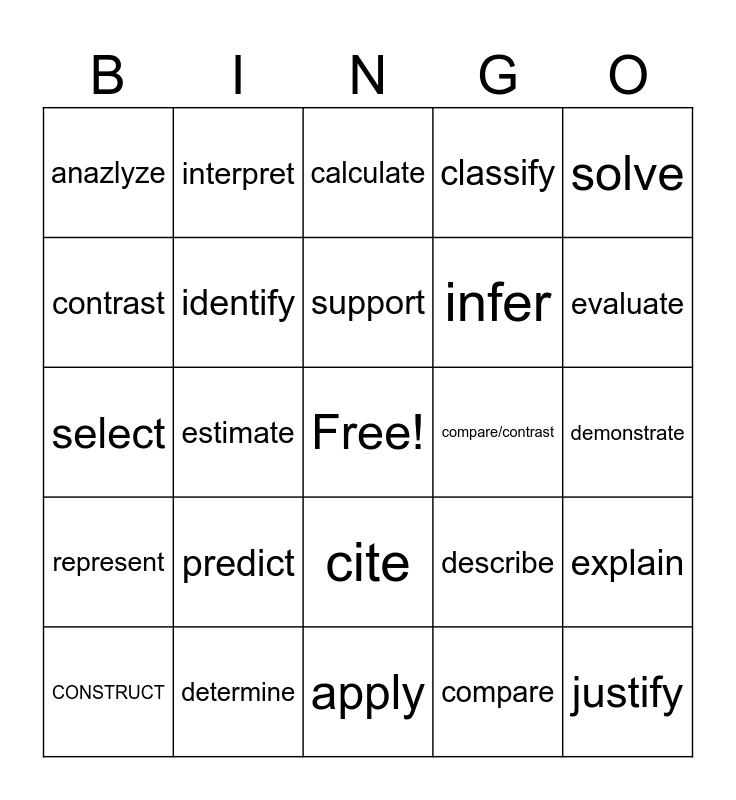This bingo card has a free space and 26 words: cite, compare, support, determine, solve, anazlyze, contrast, interpret, demonstrate, describe, infer, select, explain, CONSTRUCT, estimate, observe, classify, represent, calculate, justify, evaluate, apply, compare/contrast, predict, identify and summarize.