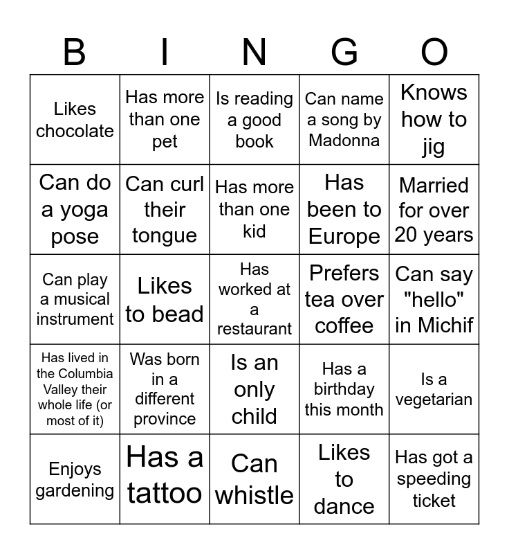 This bingo card has a free space and 24 words: Was born in a different province, Has a tattoo, Has more than one kid, Enjoys gardening, Knows how to jig, Likes chocolate, Can do a yoga pose, Has more than one pet, Prefers tea over coffee, Is an only child, Has been to Europe, Can play a musical instrument, Has a birthday this month, Is a vegetarian, Can curl their tongue, Likes to dance, Can say "hello" in Michif, Is reading a good book, Married for over 20 years, Likes to bead, Has got a speeding ticket, Has lived in the Columbia Valley their whole life (or most of it), Can name a song by Madonna and Can whistle.