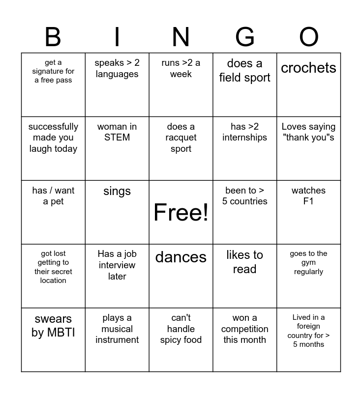 This bingo card has a free space and 24 words: Has a job interview later, plays a musical instrument, does a racquet sport, swears by MBTI, crochets, get a signature for a free pass, successfully made you laugh today, speaks > 2 languages, been to > 5 countries, dances, has >2 internships, has / want a pet, likes to read, goes to the gym regularly, woman in STEM, won a competition this month, watches F1, runs >2 a week, Loves saying "thank you"s, sings, Lived in a foreign country for > 5 months, got lost getting to their secret location, does a field sport and can't handle spicy food.