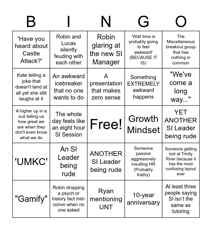 This bingo card has a free space and 24 words: An SI Leader being rude, Robin dropping a psych or history fact mid-convo when no one asked, A presentation that makes zero sense, "Gamify", The Miscellaneous breakout group that has nothing in common, 'Have you heard about Castle Attack?', Kate telling a joke that doesn't land at all yet she still laughs at it, Robin and Lucas silently feuding with each other, Growth Mindset, ANOTHER SI Leader being rude, Something EXTREMELY awkward happens, A higher up in a suit telling us how great we are when they don't even know what we do, Someone passive aggressively insulting HR (Probably Kathy), Someone getting lost at Trinity River because it has the most confusing layout ever, An awkward icebreaker that no one wants to do, 10-year anniversary, YET ANOTHER SI Leader being rude, Robin glaring at the new SI Manager, "We've come a long way...", The whole day feels like an eight hour SI Session, At least three people saying SI isn’t the same as tutoring, 'UMKC', 'Wait time is probably going to feel awkward' (BECAUSE IT IS) and Ryan mentioning UNT.