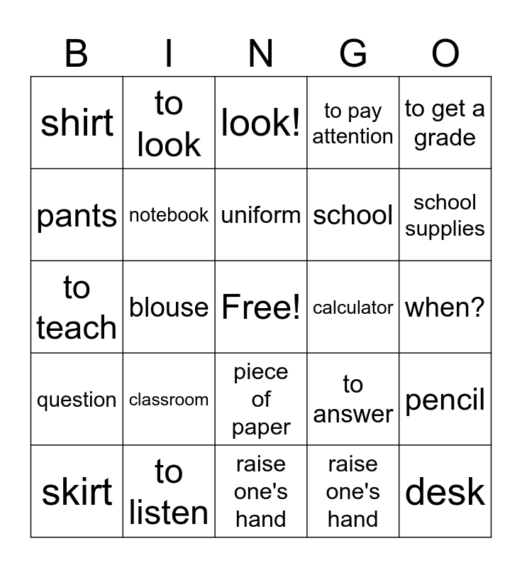 This bingo card has a free space and 37 words: give a test, good grade, to speak, notebook, pencil, classroom, uniform, What's up?, to get a grade, to take a test, blouse, to pay attention, desk, when?, pants, question, to give, look!, piece of paper, calculator, shirt, school supplies, skirt, raise one's hand, skirt, raise one's hand, to look, backpack, to wear or carry, to be (not ser), to study, to listen, to teach, pen, to answer, school and book.