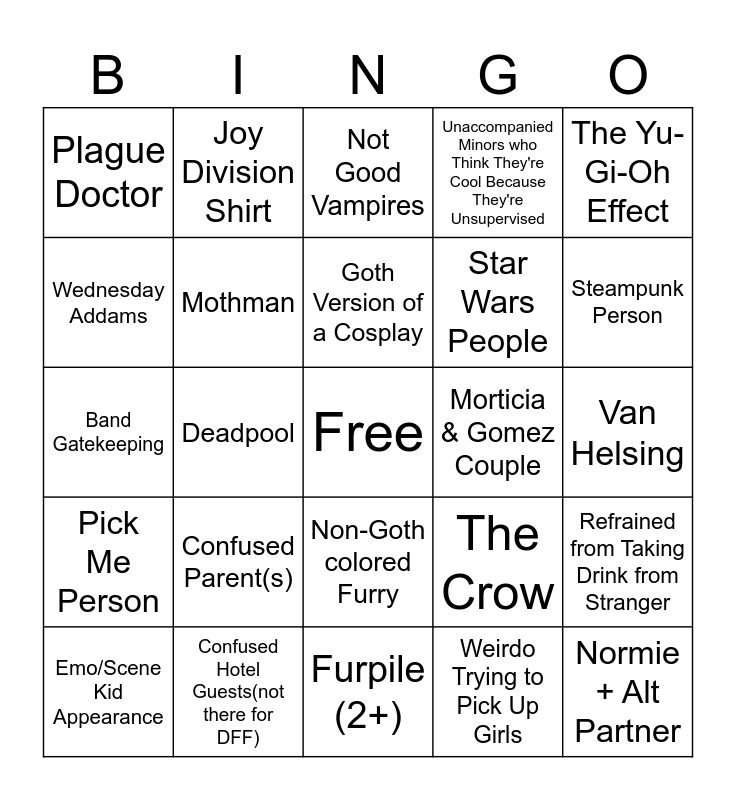 This bingo card has a free space and 24 words: Confused Parent(s), Confused Hotel Guests(not there for DFF), Goth Version of a Cosplay, Emo/Scene Kid Appearance, The Yu-Gi-Oh Effect, Plague Doctor, Wednesday Addams, Joy Division Shirt, Morticia & Gomez Couple, Non-Goth colored Furry, Star Wars People, Band Gatekeeping, The Crow, Refrained from Taking Drink from Stranger, Mothman, Weirdo Trying to Pick Up Girls, Van Helsing, Not Good Vampires, Steampunk Person, Deadpool, Normie + Alt Partner, Pick Me Person, Unaccompanied Minors who Think They're Cool Because They're Unsupervised and Furpile (2+).