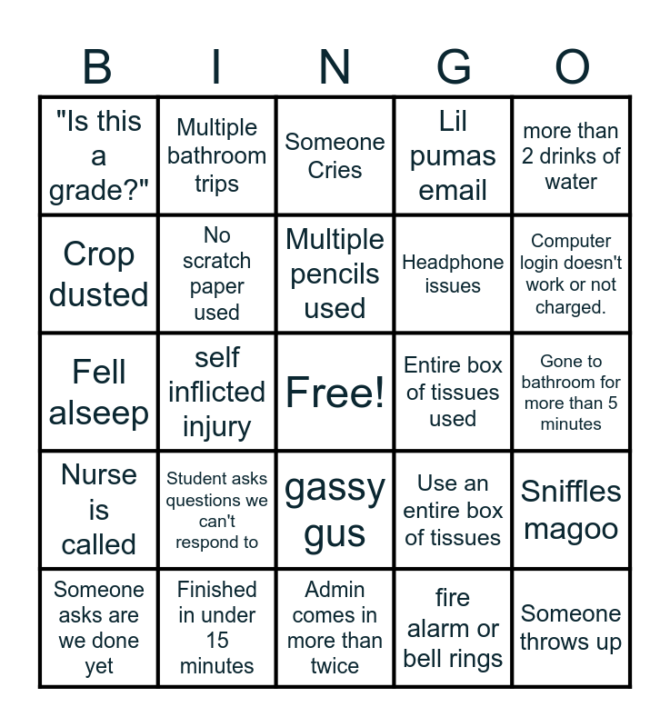This bingo card has a free space and 27 words: Use an entire box of tissues, Someone shouts that was easy!, Headphone issues, Admin comes in more than twice, Crop dusted, Someone Cries, Multiple bathroom trips, Nurse is called, Entire box of tissues used, Sniffles magoo, Fell alseep, Lil pumas email, Someone asks are we done yet, Finished in under 15 minutes, Computer login doesn't work or not charged., Power or internet goes out, No scratch paper used, Multiple pencils used, Student asks questions we can't respond to, "Is this a grade?", Gone to bathroom for more than 5 minutes, fire alarm or bell rings, self inflicted injury, Someone throws up, gassy gus, more than 2 drinks of water and Badgered.