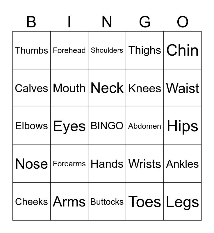 This bingo card has a free space and 33 words: Head, Face, Eyes, Ears, Nose, Mouth, Chin, Cheeks, Forehead, Hair, Neck, Shoulders, Chest, Back, Abdomen, Waist, Arms, Elbows, Forearms, Wrists, Hands, Fingers, Thumbs, Hips, Buttocks, Legs, Thighs, Knees, Calves, Ankles, Feet, Toes and Heels.
