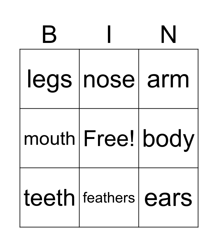 This bingo card has a free space and 14 words: wings, head, body, legs, arm, mouth, beak, tail, eyes, nose, ears, teeth, feathers and fur.