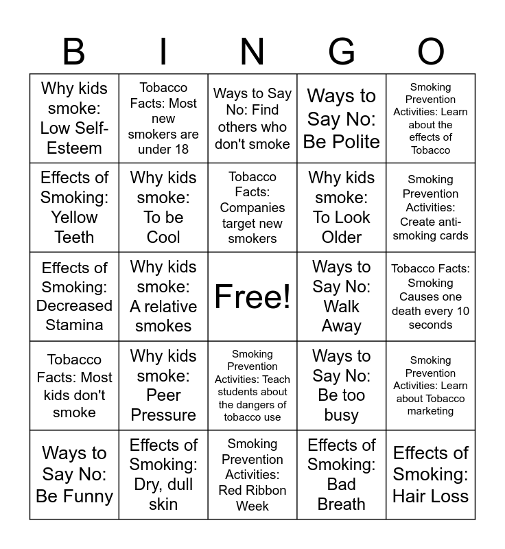 Smoking Prevention Bingo | Smoking Prevention Bingo | Smoking Prevention Bingo | DRUG PREVENTION | Smoking Prevention Bingo