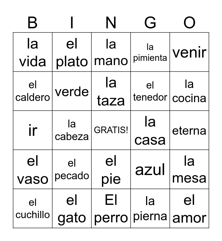 This bingo card has a free space and 29 words: el cuchillo, la sangre, la cabeza, la sal, la vida, la mano, verde, el pecado, la casa, el gato, eterna, el amor, El perro, la pierna, la cocina, el ojo, el pie, el vaso, venir, ir, azul, el libro, el tenedor, el caldero, la pimienta, el plato, la mesa, la taza and Dios.