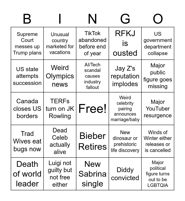 This bingo card has a free space and 24 words: Dead Celeb actually alive, Luigi not guilty but not free either, AI/Tech scandal causes industry fallout, Death of world leader, US government department collapse, Supreme Court messes up Trump plans, US state attempts succession, Unusual country marketed for vacations, Weird celebrity pairing announces marriage/baby, Bieber Retires, Jay Z's reputation implodes, Canada closes US borders, New dinosaur or prehistoric life discovery, Winds of Winter either releases or is cancelled, Weird Olympics news, Diddy convicted, Major YouTuber resurgence, TikTok abandoned before end of year, Major public figure goes missing, TERFs turn on JK Rowling, Major political figure turns out to be LGBTQIA, Trad Wives eat bugs now, RFKJ is ousted and New Sabrina single.