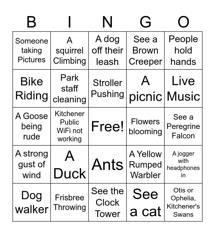 This bingo card has a free space and 24 words: A Duck, Frisbree Throwing, Stroller Pushing, Dog walker, People hold hands, Someone taking Pictures, Bike Riding, A squirrel Climbing, Flowers blooming, Ants, A picnic, A Goose being rude, A Yellow Rumped Warbler, A jogger with headphones in, Park staff cleaning, See a cat, See a Peregrine Falcon, A dog off their leash, Live Music, Kitchener Public WiFi not working, Otis or Ophelia, Kitchener's Swans, A strong gust of wind, See a Brown Creeper and See the Clock Tower.