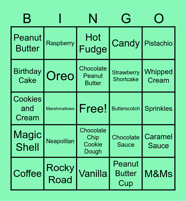 This bingo card has a free space and 24 words: Neapolitan, Rocky Road, Chocolate Peanut Butter, Coffee, Pistachio, Peanut Butter, Birthday Cake, Raspberry, Butterscotch, Chocolate Chip Cookie Dough, Strawberry Shortcake, Cookies and Cream, Chocolate Sauce, Caramel Sauce, Oreo, Peanut Butter Cup, Sprinkles, Hot Fudge, Whipped Cream, Marshmallows, M&Ms, Magic Shell, Candy and Vanilla.