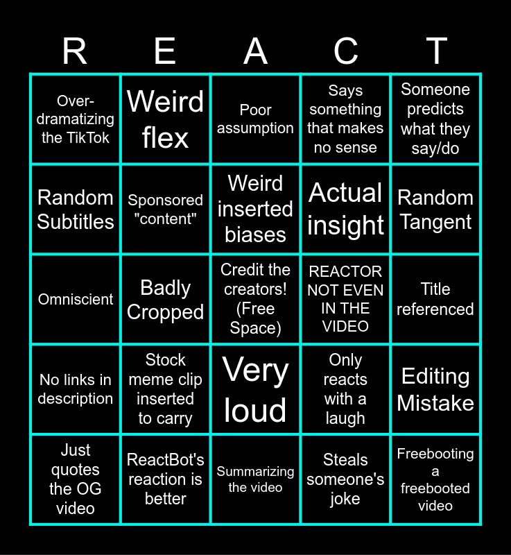 This bingo card has a free space and 46 words: Forgets to React, Freebooting a freebooted video, Shaky Cam, Summarizing the video, Stock meme clip inserted to carry, Nothing burger, Weird flex, Talking over the person in the video, Random Subtitles, Unneeded sound effect, Sponsored "content", Says something that makes no sense, Editing Mistake, Only reacts with a laugh, Cringe commentary, TikTok doesn't match the title, Weird inserted biases, REACTOR NOT EVEN IN THE VIDEO, Random graphic that adds nothing, Someone predicts what they say/do, Badly Cropped, Steals someone's joke, Over-dramatizing the TikTok, Actual insight, ...that was it?, Random Tangent, Just quotes the OG video, Bullies person in video, Very loud, No links in description, "This is me...", Editor doing HEAVY lifting, No credit onscreen, Replays the video, Bot Glazing in comments, ReactBot's reaction is better, Title referenced, Nonstop talking, “This guy”(creator vaguely referenced), Someones’s prediction is too thunk, Strange fabrication, Poor assumption, Omniscient, Repeated of a called Bingo space, ReactBot has a BAD take and Tags are unrelated.