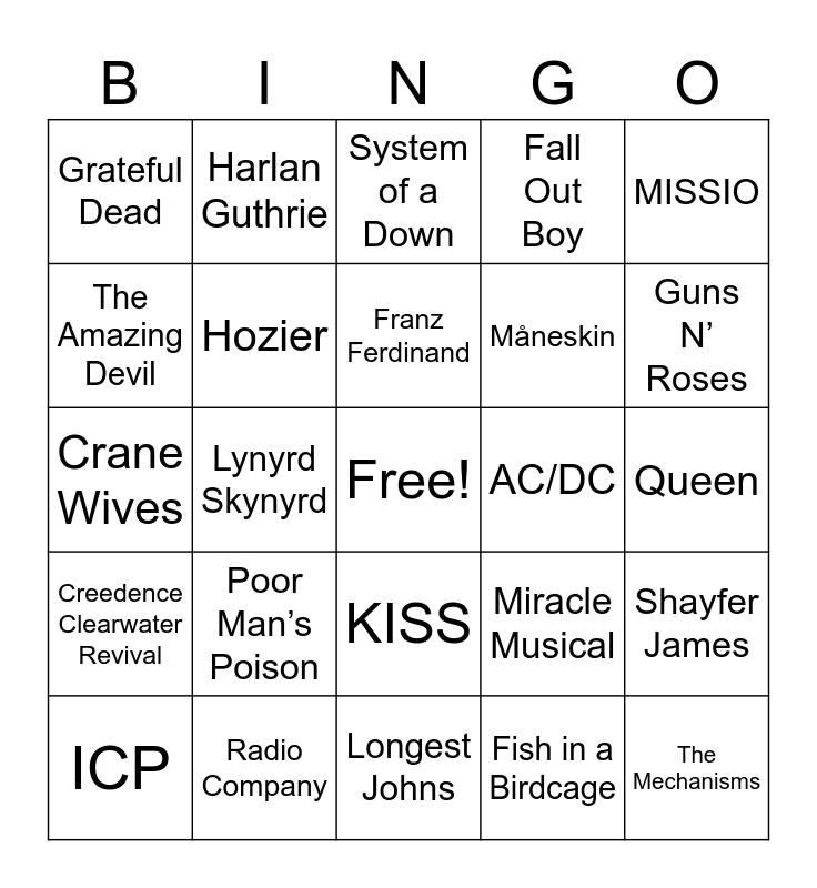 This bingo card has a free space and 24 words: Poor Man’s Poison, Radio Company, Franz Ferdinand, ICP, MISSIO, Grateful Dead, The Amazing Devil, Harlan Guthrie, AC/DC, KISS, Måneskin, Crane Wives, Miracle Musical, Shayfer James, Hozier, Fish in a Birdcage, Queen, System of a Down, Guns N’ Roses, Lynyrd Skynyrd, The Mechanisms, Creedence Clearwater Revival, Fall Out Boy and Longest Johns.