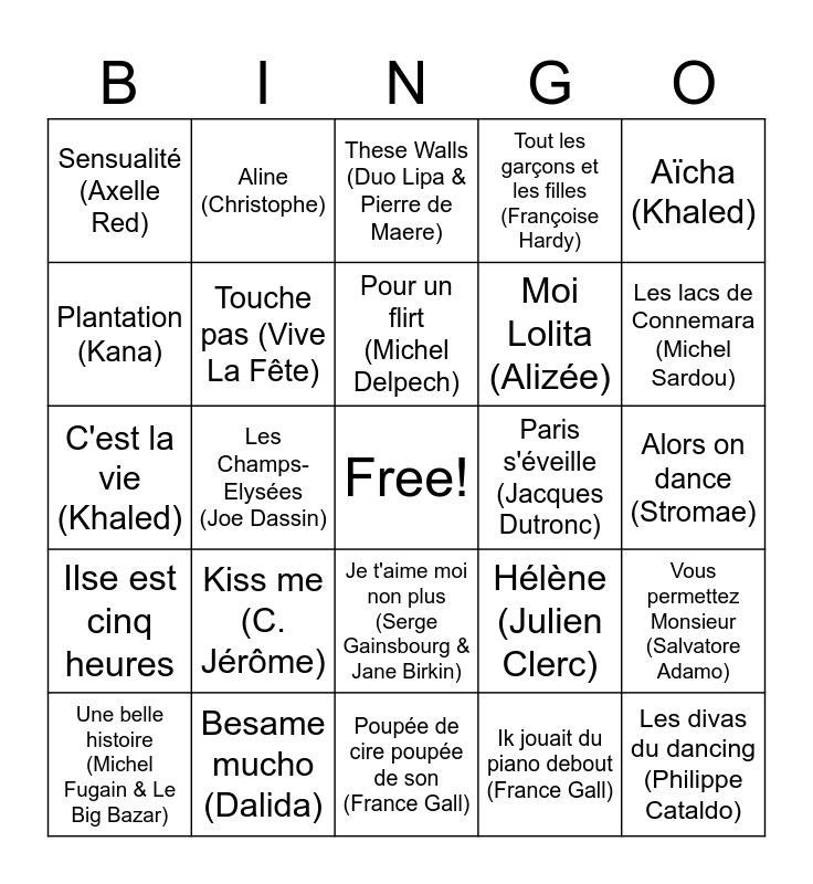 This bingo card has a free space and 69 words: Voilà (Barbara Pravi), Alors on dance (Stromae), Je ne rêve plus de toi (K's Choice), Les filles du bord de mer (Arno), Besame mucho (Dalida), Christine (Christine & the queens), Tout les garçons et les filles (Françoise Hardy), La vie en rose (Grace Jones), Aïcha (Khaled), Joe le taxi (Vanessa Paradis), Vous permettez Monsieur (Salvatore Adamo), Balance ton quoi (Angèle), Sensualité (Axelle Red), These Walls (Duo Lipa & Pierre de Maere), Ne partez pas sans moi (Céline Dion), Les Champs-Elysées (Joe Dassin), Je t'aime moi non plus (Serge Gainsbourg & Jane Birkin), Moi Lolita (Alizée), Jaime la vie (Sandra Kim), Ilse est cinq heures, Paris s'éveille (Jacques Dutronc), Hélène (Julien Clerc), Les lacs de Connemara (Michel Sardou), La tribu de Dana (Manau), Caprio c'est fini (Herve Vilard), Et c'est parti (Nâdiya & Smartzee), Alexandrie Alexendra (Claude François), Ca plane pour moi (Plastic Bertrand), Ik jouait du piano debout (France Gall), Non non rien n'a changé (Les Poppys), Aline (Christophe), Je suis venue te dire que je m'en vais (Jo Lemaire & Flouze), Kingston Kingston (Lou & the Hollywood Bananas), La ballade des gens heureux (Gérard Lenorman), Casser la voix (Patrick Bruel), Voyage voyage (Desireless), Je vole (Louane), Milord (Édith Piaf), Pour que tu m'aimes encore (Céline Dion), Plantation (Kana), C'est bon pour le moral (la Compagnie Créole), Kiss me (C. Jérôme), Les divas du dancing (Philippe Cataldo), Amoureux solitaires (Lio), Désenchantée, For me formidable (Charles Aznavour), Une belle histoire (Michel Fugain & Le Big Bazar), Ma femme (Sacha Distel), Tu es foutu (In-Grid), Papaoutai (Stromae), Touche pas (Vive La Fête), Pour un flirt (Michel Delpech), Quand les zosiaux chantent dans les bois (Urbanus), Dernière danse (Indila), Poupée de cire poupée de son (France Gall), Bruxelles (Jacques Brel), Boum! (Charles Trenet), C'est ma vie (Salvatore Adamo), Paroles paroles (Dalida & Alain Delon), Est-ce que tu m'aimes (Gims), C'est la vie (Khaled), Sur ma route (Black M), Le Renard et la belette (Laïs), Les yeux de ma mère (Arno), O la la la (TC Matic), Gigi l'amoroso (Dalida), Ne me quitte pas (Jacques Brel), Comment ça va (The Shorts), Après toi (Vicky Leandros) and Tu te reconnaitras (Anne-Marie David).