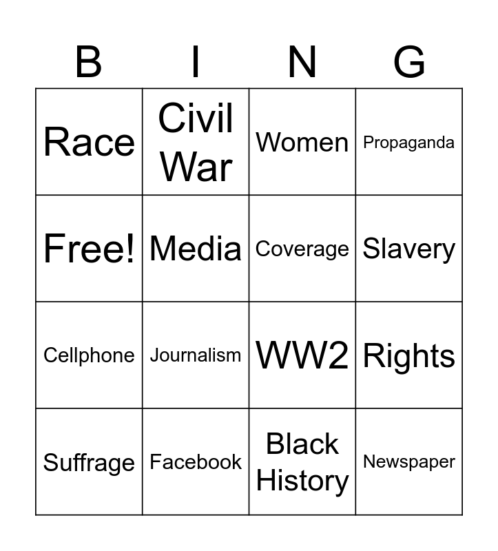 This bingo card has 16 words: Facebook, Rights, Women, Race, Cellphone, Civil War, WW2, Black History, Free!, Media, Suffrage, Propaganda, Journalism, Slavery, Coverage and Newspaper.
