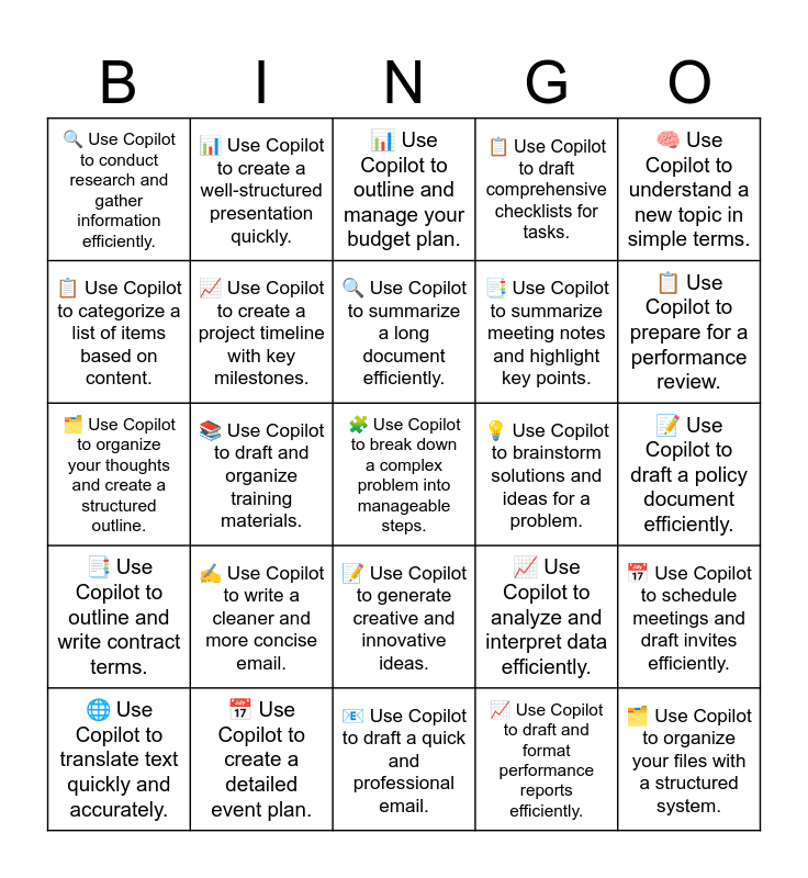 This bingo card has 25 words: ✍️ Use Copilot to write a cleaner and more concise email., 📧 Use Copilot to draft a quick and professional email., 🔍 Use Copilot to summarize a long document efficiently., 🌐 Use Copilot to translate text quickly and accurately., 🧠 Use Copilot to understand a new topic in simple terms., 🔍 Use Copilot to conduct research and gather information efficiently., 📋 Use Copilot to categorize a list of items based on content., 📊 Use Copilot to create a well-structured presentation quickly., 💡 Use Copilot to brainstorm solutions and ideas for a problem., 📝 Use Copilot to generate creative and innovative ideas., 📑 Use Copilot to summarize meeting notes and highlight key points., 🗂️ Use Copilot to organize your thoughts and create a structured outline., 📈 Use Copilot to analyze and interpret data efficiently., 📅 Use Copilot to schedule meetings and draft invites efficiently., 📈 Use Copilot to create a project timeline with key milestones., 🗂️ Use Copilot to organize your files with a structured system., 📝 Use Copilot to draft a policy document efficiently., 📊 Use Copilot to outline and manage your budget plan., 📋 Use Copilot to prepare for a performance review., 📚 Use Copilot to draft and organize training materials., 🧩 Use Copilot to break down a complex problem into manageable steps., 📅 Use Copilot to create a detailed event plan., 📑 Use Copilot to outline and write contract terms., 📋 Use Copilot to draft comprehensive checklists for tasks. and 📈 Use Copilot to draft and format performance reports efficiently..