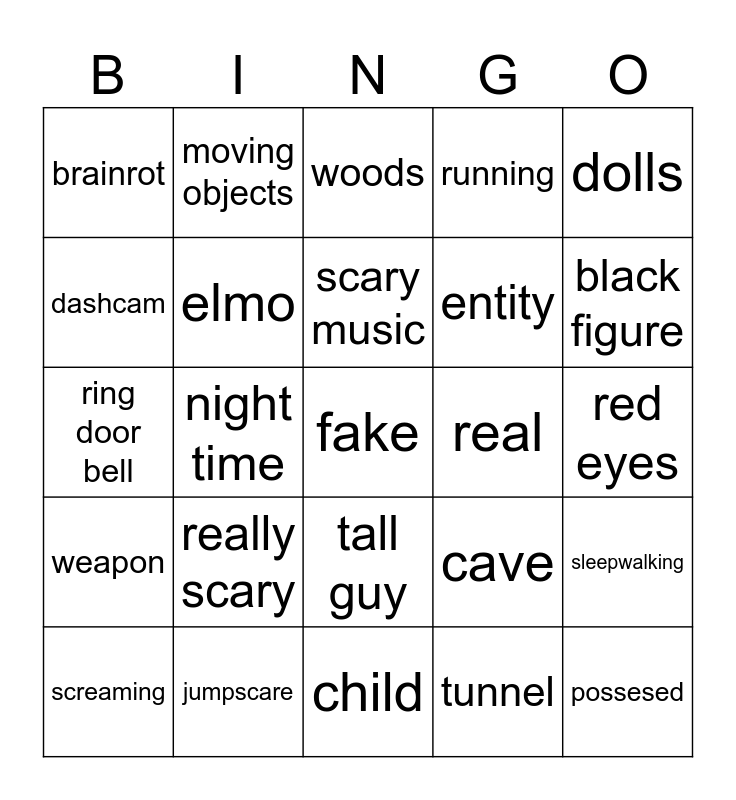 This bingo card has a free space and 24 words: really scary, jumpscare, scary music, screaming, dolls, brainrot, dashcam, moving objects, real, tall guy, entity, ring door bell, cave, sleepwalking, elmo, tunnel, red eyes, woods, black figure, night time, possesed, weapon, running and child.