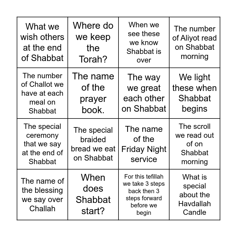 This bingo card has 22 words: When does Shabbat start?, What is this weeks Parashat HaShavuah (Weekly Torah Portion)?, Where do we keep the Torah?, What are 3 things you need for Havdallah?, The name of the prayer book., The way we great each other on Shabbat, What we wish others at the end of Shabbat, When we see these we know Shabbat is over, The name of the Friday Night service, What is special about the Havdallah Candle, The special ceremony that we say at the end of Shabbat, The number of Aliyot read on Shabbat morning, What do we do at the end of Lecha Dodi?, This tefillah tells us to love God with all our hearts, For this tefillah we take 3 steps back then 3 steps forward before we begin, The prayer over wine/grape juice, The scroll we read out of on Shabbat morning, The name of the blessing we say over Challah, The special braided bread we eat on Shabbat, The number of Challot we have at each meal on Shabbat, We light these when Shabbat begins and The name of the room we use for tefillah (prayers) at Ramah Sasson.