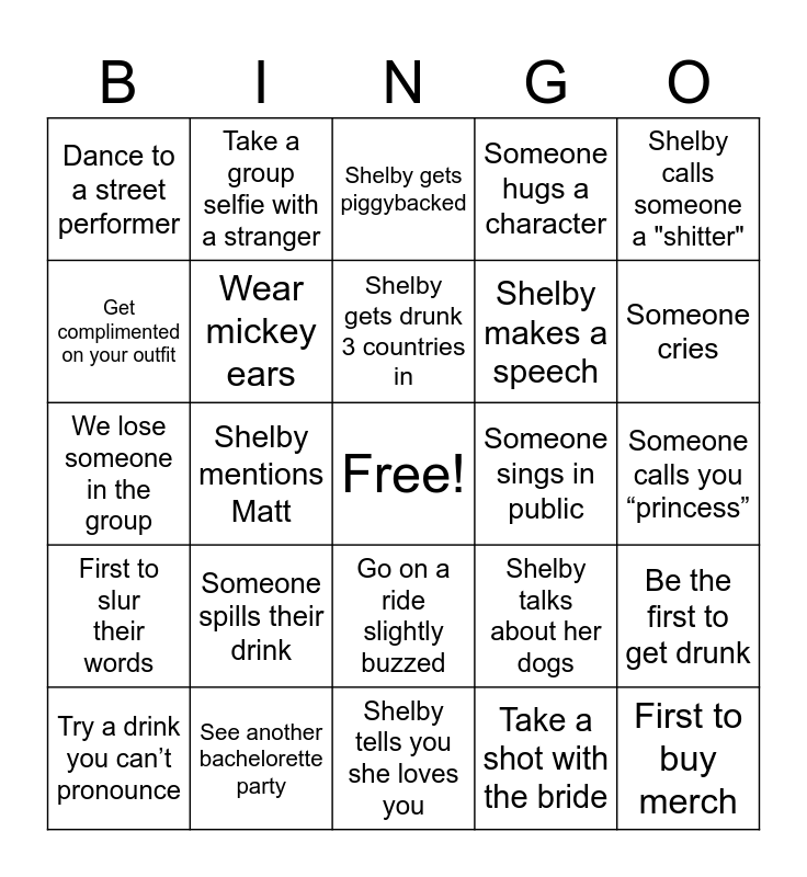 This bingo card has a free space and 24 words: Someone spills their drink, See another bachelorette party, Shelby gets drunk 3 countries in, Try a drink you can’t pronounce, Shelby calls someone a "shitter", Dance to a street performer, Get complimented on your outfit, Take a group selfie with a stranger, Someone sings in public, Go on a ride slightly buzzed, Shelby makes a speech, We lose someone in the group, Shelby talks about her dogs, Be the first to get drunk, Wear mickey ears, Take a shot with the bride, Someone calls you “princess”, Shelby gets piggybacked, Someone cries, Shelby mentions Matt, First to buy merch, First to slur their words, Someone hugs a character and Shelby tells you she loves you.
