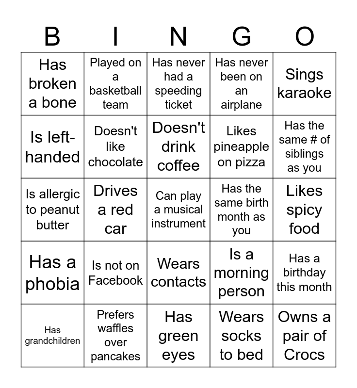 This bingo card has 25 words: Is not on Facebook, Has green eyes, Doesn't drink coffee, Has grandchildren, Sings karaoke, Has broken a bone, Is left-handed, Played on a basketball team, Has the same birth month as you, Wears contacts, Likes pineapple on pizza, Is allergic to peanut butter, Is a morning person, Has a birthday this month, Doesn't like chocolate, Owns a pair of Crocs, Likes spicy food, Has never had a speeding ticket, Has the same # of siblings as you, Drives a red car, Can play a musical instrument, Prefers waffles over pancakes, Has a phobia, Has never been on an airplane and Wears socks to bed.