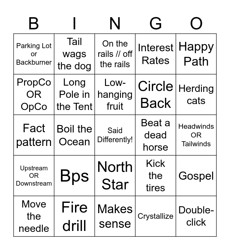 This bingo card has a free space and 38 words: Said Differently (2nd time), Fullness of time, Wood to Chop, Long Pole in the Tent, Gospel, Bps, Low-hanging fruit, Thread the needle, Happy Path, Circle Back, Boil the Ocean, Interest Rates, Double-click, Headwinds OR Tailwinds, PropCo OR OpCo, Upstream OR Downstream, Bottom of the Ocean OR Red Ocean, On the rails // off the rails, Course Correct, Beat a dead horse, Parking Lot or Backburner, Fire drill, Herding cats, Move the needle, Let’s take this offline, Makes sense, Ground shifting beneath our feet, I don’t disagree, Reinvent the wheel, Lightning in a bottle, That’s a good callout, North Star, Crystallize, Tail wags the dog, 100%, Kick the tires, Fact pattern and Double-edged sword.