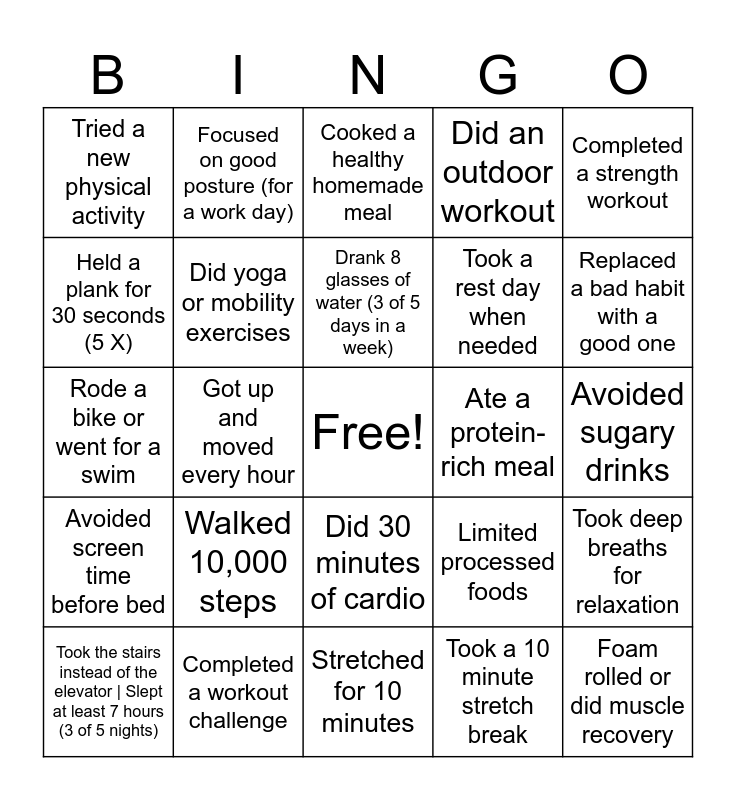 This bingo card has a free space and 25 words: Walked 10,000 steps, Stretched for 10 minutes, Drank 8 glasses of water (3 of 5 days in a week), Took the stairs instead of the elevator | Slept at least 7 hours (3 of 5 nights), Completed a strength workout, Tried a new physical activity, Held a plank for 30 seconds (5 X), Focused on good posture (for a work day), Ate a protein-rich meal, Did 30 minutes of cardio, Took a rest day when needed, Rode a bike or went for a swim, Limited processed foods, Took deep breaths for relaxation, Did yoga or mobility exercises, Walked outside for fresh air, Avoided sugary drinks, Cooked a healthy homemade meal, Replaced a bad habit with a good one, Got up and moved every hour, Foam rolled or did muscle recovery, Completed a workout challenge, Avoided screen time before bed, Did an outdoor workout and Took a 10 minute stretch break.
