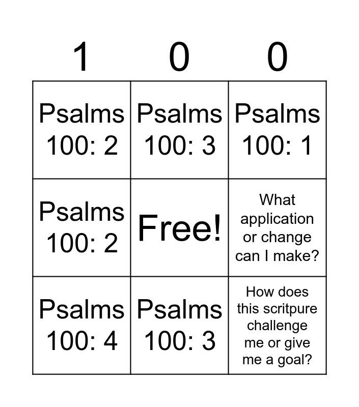 This bingo card has a free space and 16 words: How does this scritpure challenge me or give me a goal?, What application or change can I make?, Psalms 100: 1, Psalms 100: 2, Psalms 100: 2, Psalms 100: 3, Psalms 100: 4, Psalms 100: 5, How does this scritpure challenge me or give me a goal?, What application or change can I make?, Psalms 100: 1, Psalms 100: 2, Psalms 100: 2, Psalms 100: 3, Psalms 100: 4 and Psalms 100: 5.