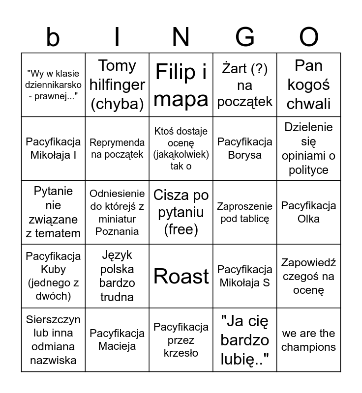 This bingo card has a free space and 24 words: Język polska bardzo trudna, Pacyfikacja Macieja, Ktoś dostaje ocenę (jakąkolwiek) tak o, Sierszczyn lub inna odmiana nazwiska, Pan kogoś chwali, "Wy w klasie dziennikarsko - prawnej...", Pacyfikacja Mikołaja I, Tomy hilfinger (chyba), Zaproszenie pod tablicę, Roast, Pacyfikacja Borysa, Pytanie nie związane z tematem, Pacyfikacja Mikołaja S, Zapowiedź czegoś na ocenę, Reprymenda na początek, "Ja cię bardzo lubię..", Pacyfikacja Olka, Filip i mapa, Dzielenie się opiniami o polityce, Odniesienie do którejś z miniatur Poznania, we are the champions, Pacyfikacja Kuby (jednego z dwóch), Żart (?) na początek and Pacyfikacja przez krzesło.