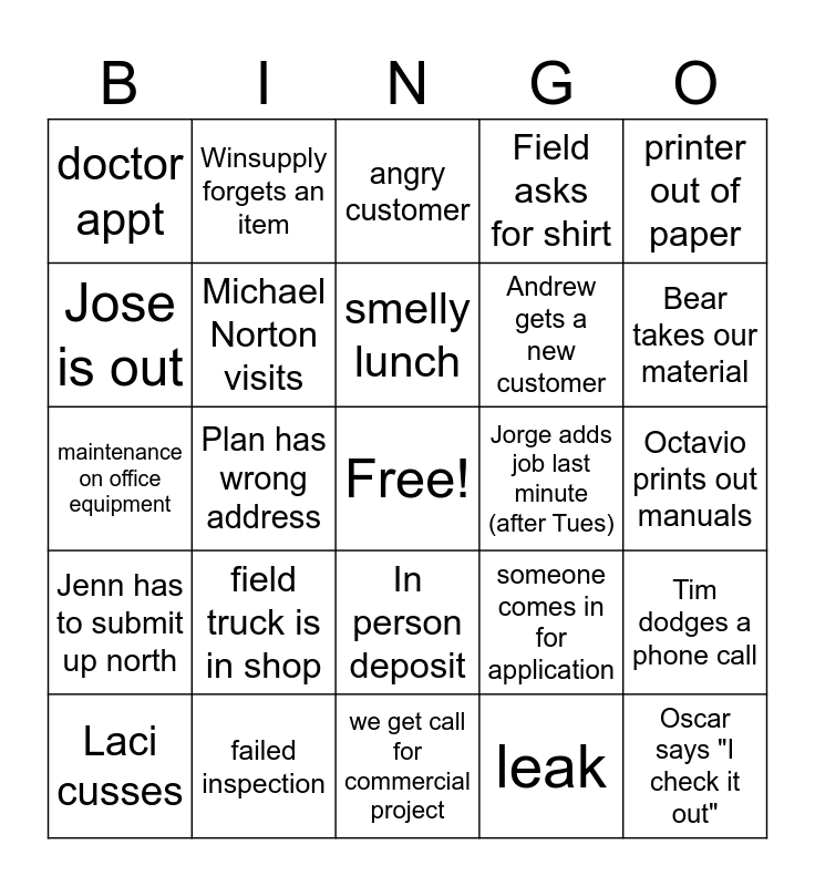 This bingo card has a free space and 29 words: salesman visits, failed inspection, angry customer, timesheet correction, printer out of paper, doctor appt, Michael Norton visits, smelly lunch, Jorge adds job last minute (after Tues), Tim dodges a phone call, Laci cusses, Plan has wrong address, leak, Oscar says "I check it out", maintenance on office equipment, Bri Brown forgets to send plot plans, we get call for commercial project, someone comes in for application, Bear takes our material, Jenn has to submit up north, field truck is in shop, Pace forgets an item, Andrew gets a new customer, Octavio prints out manuals, Jose is out, Winsupply forgets an item, In person deposit, Field asks for shirt and Field has to buy tool.