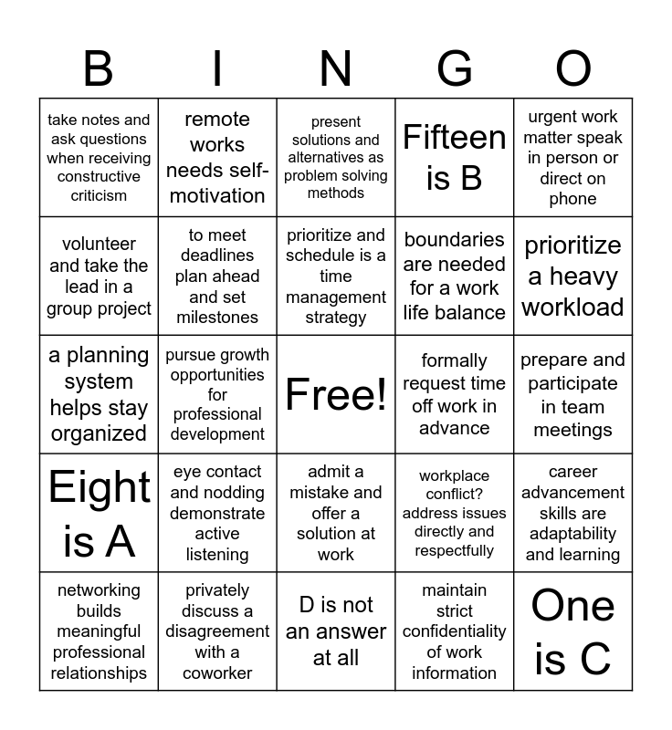 This bingo card has a free space and 24 words: eye contact and nodding demonstrate active listening, privately discuss a disagreement with a coworker, prioritize and schedule is a time management strategy, networking builds meaningful professional relationships, urgent work matter speak in person or direct on phone, take notes and ask questions when receiving constructive criticism, volunteer and take the lead in a group project, remote works needs self- motivation, formally request time off work in advance, admit a mistake and offer a solution at work, boundaries are needed for a work life balance, a planning system helps stay organized, workplace conflict? address issues directly and respectfully, career advancement skills are adaptability and learning, to meet deadlines plan ahead and set milestones, maintain strict confidentiality of work information, prepare and participate in team meetings, present solutions and alternatives as problem solving methods, prioritize a heavy workload, pursue growth opportunities for professional development, One is C, Eight is A, Fifteen is B and D is not an answer at all.