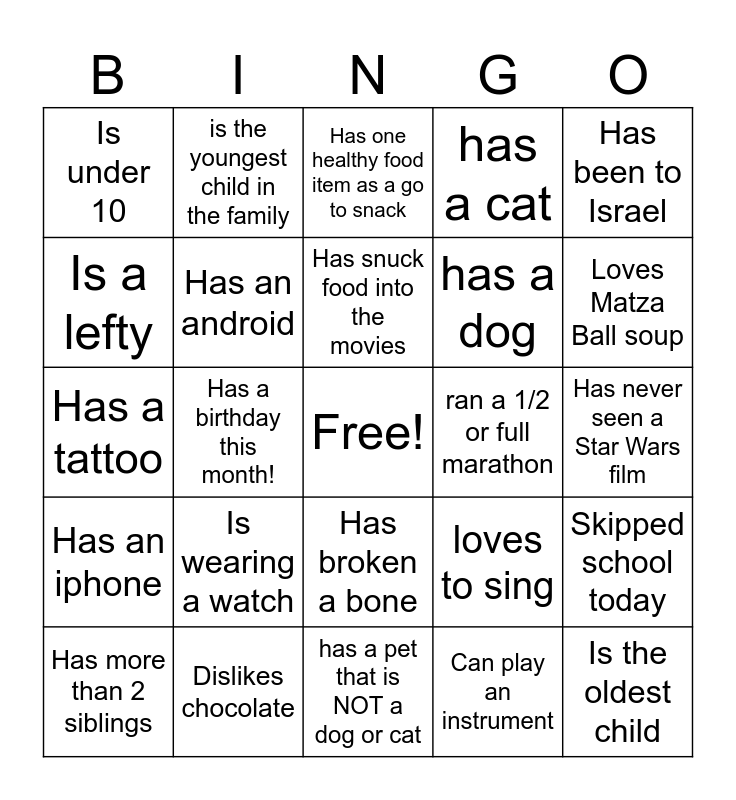 This bingo card has a free space and 32 words: Can play an instrument, Has attended Ramah Sasson before, Has a birthday this month!, Wears glasses / contacts, Has an iphone, Has an android, Has been to Israel, Skipped school today, is the youngest child in the family, is the middle child in the family, Has snuck food into the movies, Has one healthy food item as a go to snack, Eats Matza year-round, Has lived in another country, ran a 1/2 or full marathon, Is an only child, Has more than 2 siblings, Has a tattoo, Has broken a bone, Is wearing a watch, loves to sing, Has a food allergy, Has never seen a Star Wars film, Dislikes chocolate, Is the oldest child, has a cat, has a dog, Is a lefty, Is under 10, has a pet that is NOT a dog or cat, Can't wait for Shabbat brownies and Loves Matza Ball soup.