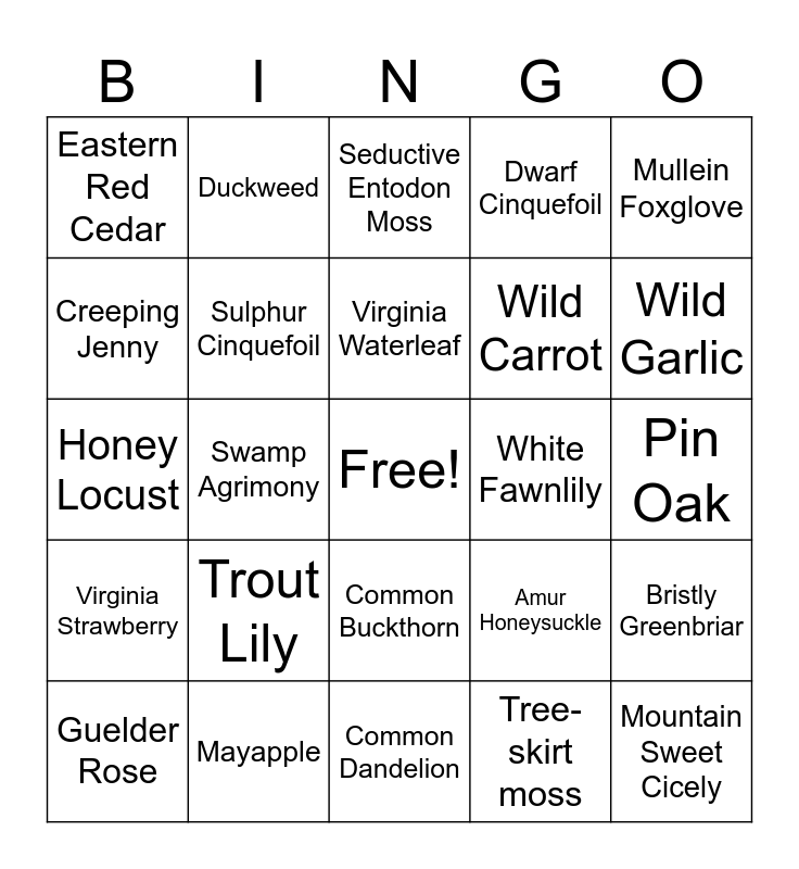 This bingo card has a free space and 24 words: Trout Lily, Mayapple, Virginia Waterleaf, Guelder Rose, Mullein Foxglove, Eastern Red Cedar, Creeping Jenny, Duckweed, White Fawnlily, Common Buckthorn, Wild Carrot, Honey Locust, Amur Honeysuckle, Bristly Greenbriar, Sulphur Cinquefoil, Tree-skirt moss, Pin Oak, Seductive Entodon Moss, Wild Garlic, Swamp Agrimony, Mountain Sweet Cicely, Virginia Strawberry, Dwarf Cinquefoil and Common Dandelion.