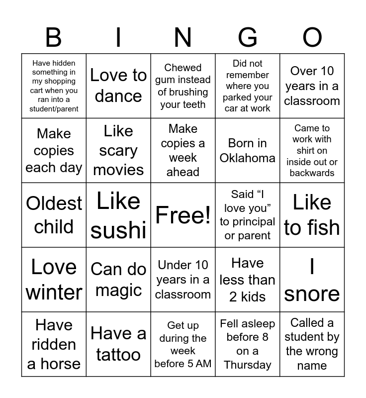 This bingo card has a free space and 44 words: Lost keys more than once this year - at school!, Called a student by the wrong name, Love to bake, Have ridden a horse, Youngest child, Fell asleep before 8 on a Thursday, Chewed gum instead of brushing your teeth, I am a tech nerd, Over 10 years in a classroom, Have a tattoo, Did not remember where you parked your car at work, Said “I love you” to principal or parent, Under 10 years in a classroom, Can do magic, Left lesson plans at home, Get up during the week before 5 AM, Play the piano, Oldest child, Love to read, Came to work with shirt on inside out or backwards, Love to dance, Own a pet, Middle child, Have hidden something in my shopping cart when you ran into a student/parent, Secretly watch reality trash TV, Like to fish, Have more than 2 kids, Hate pizza, Have less than 2 kids, Love winter, Love summer, I snore, I like to sew, I play video games – not on phone, Like sushi, Love spicy food, Jack’d Up over Squeezed Lemon, Squeezed Lemon over Jack’d Up, Make copies a week ahead, Make copies each day, Born in Oklahoma, Have read all the Harry Potter books, Like scary movies and Not shy in front of people.