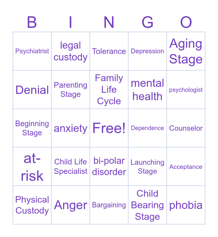 This bingo card has a free space and 24 words: Physical Custody, Child Life Specialist, Family Life Cycle, Child Bearing Stage, Aging Stage, Psychiatrist, legal custody, Tolerance, Dependence, Counselor, Beginning Stage, Parenting Stage, Launching Stage, Acceptance, Denial, Anger, Bargaining, Depression, psychologist, at-risk, anxiety, bi-polar disorder, mental health and phobia.