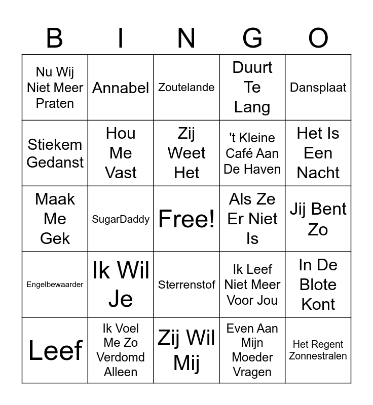This bingo card has a free space and 45 words: Onderweg, Het Regent Zonnestralen, Bloed, Zweet En Tranen, Leef, Beetje Van Mij, Even Aan Mijn Moeder Vragen, Zoutelande, Het Land Van Maas En Waal, Dansplaat, Ik Voel Me Zo Verdomd Alleen, Duurt Te Lang, Als Ze Er Niet Is, Sterrenstof, Ik Wil Je, Sinds 1 Dag Of 2, Zij Wil Mij, Jij Denkt Maar Dat Je Alles Mag Van Mij, Maak Me Gek, Noodgeval, Het Is Een Nacht, Annabel, Belgïe, Een Eigen Huis, Nu Wij Niet Meer Praten, Als De Morgen Is Gekomen, Jij Bent Zo, Parijs, Ademnood, Ik Leef Niet Meer Voor Jou, Engelbewaarder, Hoe, In De Blote Kont, Rosanne, Sexy Als Ik Dans, Malle Babbe, SugarDaddy, Iedereen Is Van De Wereld, Blijven Slapen, Goud, Zij Weet Het, Stiekem Gedanst, 't Kleine Café Aan De Haven, Suzanne, Hou Me Vast and Ik Heb De Hele Nacht Liggen Dromen.