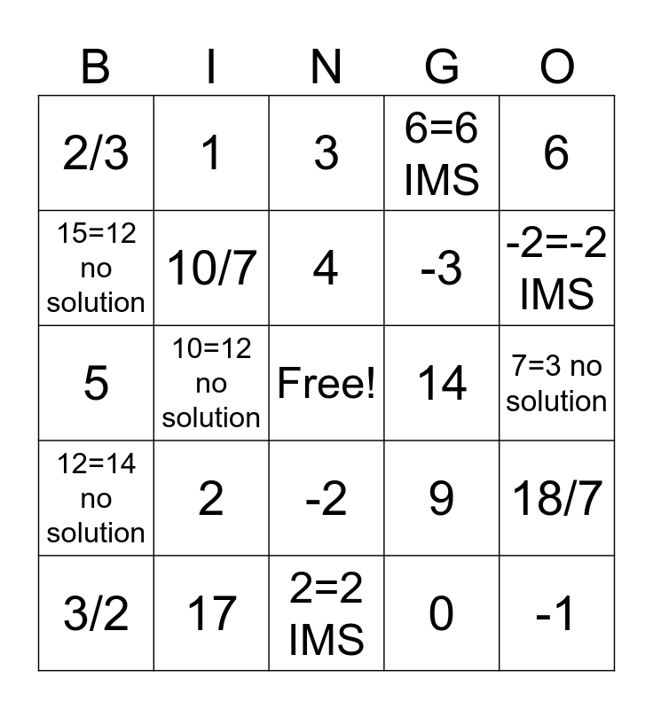 This bingo card has a free space and 24 words: 3/2, 2, 4, 0, 6, 2/3, 1, 3, 14, 7=3 no solution, 5, 10/7, 9, 18/7, 15=12 no solution, 17, 2=2 IMS, 6=6 IMS, -2=-2 IMS, 12=14 no solution, 10=12 no solution, -2, -3 and -1.
