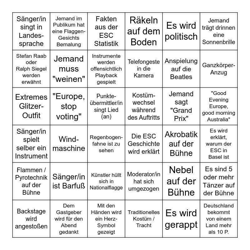 This bingo card has 36 words: Moderator/in hat sich umgezogen, Künstler hüllt sich in Nationalflagge, Traditionelles Kostüm / Tracht, Stefan Raab oder Ralph Siegel werden erwähnt, Sänger/in spielt selber ein Instrument, Kostüm-wechsel während des Auftritts, Jemand muss "weinen", Mit den Händen wird ein Herz-Symbol gezeigt, Es wird politisch, Nebel auf der Bühne, Ganzkörper- Anzug, Räkeln auf dem Boden, Es sind 5 oder mehr Tänzer auf der Bühne, "Europe, stop voting", Telefongeste in die Kamera, Sänger/in singt in Landes-sprache, Flammen / Pyrotechnik auf der Bühne, Jemand sagt "Grand Prix", Extremes Glitzer-Outfit, Fakten aus der ESC Statistik, Punkte- übermittler/in singt Lied (an), Wind-maschine, Die ESC Geschichte wird erklärt, Regenbogen-fahne ist zu sehen, Akrobatik auf der Bühne, Jemand im Publikum hat eine Flaggen- Gesichts Bemalung, Anspielung auf die Beatles, Dem Gastgeber wird für den Abend gedankt, Instrumente werden offensichtlich Playback gespielt, Jemand trägt drinnen eine Sonnenbrille, Deutschland bekommt von einem Land mehr als 10 P., Backstage wird angestoßen, Es wird erklärt, warum der ESC in Basel ist, "Good Evening Europe, good morning Australia", Sänger/in ist Barfuß and Es wird gerappt.