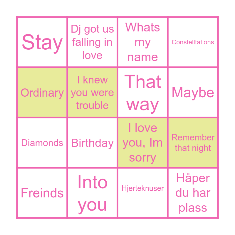 This bingo card has 26 words: Last friday night, Years, Maybe, Bad at love, Ordinary, Stay, I knew you were trouble, Dj got us falling in love, Hjerteknuser, We cant be freinds, Diamonds, I love you, Im sorry, Pinne for landet, All i want, Remember that night, Outside, Constelltations, Håper du har plass, Whats my name, Freinds, Birthday, Let the light in, Into you, Shower, That way and Crazy in love.