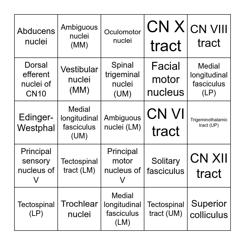 This bingo card has 47 words: Hypoglossal nuclei (LM), Ambiguous nuclei (LM), Spinal trigeminal nuclei (LM), Medial longitudinal fasciculus (LM), Tectospinal tract (LM), Hypoglossal nuclei (MM), Ambiguous nuclei (MM), Spinal trigeminal nuclei (MM), Dorsal efferent nuclei of CN10, Solitary nuclei, Vestibular nuclei (MM), CN X tract, CN XII tract, Solitary fasciculus, Cochlear nuclei, Vestibular nuclei (UM), Spinal trigeminal nuclei (UM), CN VI tract, CN VII tract, CN VIII tract, Medial longitudinal fasciculus (UM), Tectospinal tract (UM), Abducens nuclei, Facial motor nucleus, Superior olivary nucleus, Medial longitudinal fasciculus (LP), Tectospinal (LP), Lateral lemniscus (LP), Principal motor nucleus of V, Principal sensory nucleus of V, Mesencephalic nucleus of V, Trigeminothalamic tract (MP), Medial longitudinal fasciculus (MP), Lateral lemniscus (MP), Inferior colliculus, Trochlear nuclei, Trigeminothalamic tract (UP), Medial longitudinal fasciculus (UP), Lateral lemniscus (UP), Brachium of Inf colliculus (UP), Superior colliculus, Oculomotor nuclei, Edinger-Westphal, Medial geniculate, CN III tract, Trigeminothalamic tract (U mid) and Brachium of inf colliculus (U mid).