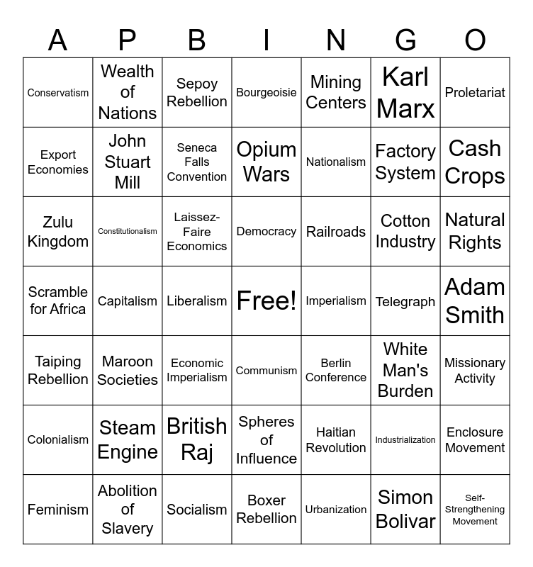 This bingo card has a free space and 49 words: Industrialization, Factory System, Urbanization, Capitalism, Laissez-Faire Economics, Adam Smith, Wealth of Nations, Socialism, Karl Marx, Communism, Proletariat, Bourgeoisie, Cotton Industry, Railroads, Steam Engine, Telegraph, Export Economies, Cash Crops, Enclosure Movement, Mining Centers, Nationalism, Liberalism, Conservatism, John Stuart Mill, Feminism, Seneca Falls Convention, Natural Rights, Abolition of Slavery, Democracy, Constitutionalism, Empiricism, Imperialism, Colonialism, British Raj, Scramble for Africa, Berlin Conference, White Man's Burden, Missionary Activity, Zulu Kingdom, Economic Imperialism, Spheres of Influence, Taiping Rebellion, Self-Strengthening Movement, Boxer Rebellion, Opium Wars, Sepoy Rebellion, Haitian Revolution, Maroon Societies and Simon Bolivar.