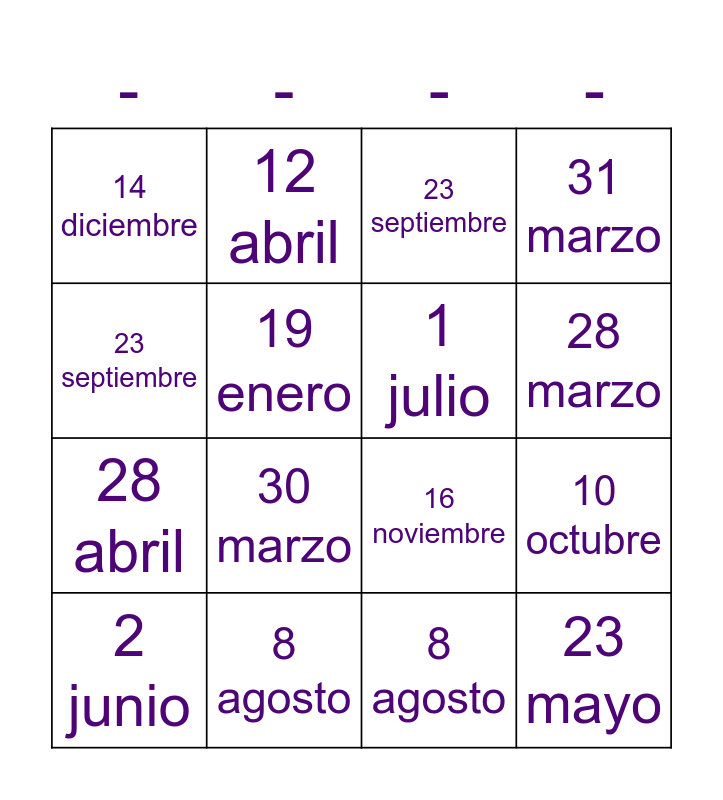 This bingo card has 24 words: 23 julio, 13 diciembre, 28 marzo, 23 octubre, 23 septiembre, 14 diciembre, 19 enero, 12 abril, 8 agosto, 25 mayo, 28 abril, 16 noviembre, 9 octubre, 13 septiembre, 1 julio, 15 junio, 8 agosto, 23 septiembre, 30 marzo, 10 octubre, 2 junio, 23 mayo, 31 marzo and 22 octubre.