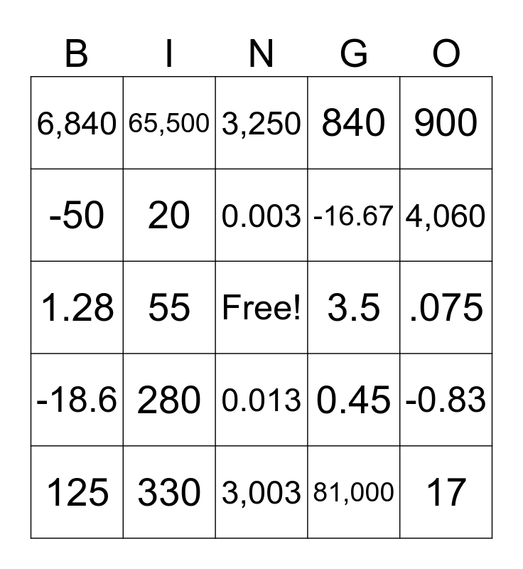 This bingo card has a free space and 28 words: -0.83, 0.42, -16.67, 81,000, -50, 3,250, 65,500, -18.6, 3.5, 125, 1.28, 840, 330, 3,003, 4,060, 420, 280, 20, 0.003, 0.013, 6,840, 26, 17, 55, .075, 0.45, 900 and 270.