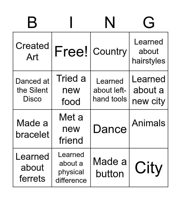 This bingo card has 19 words: Dance, Food, Country, City, Animals, Danced at the Silent Disco, Made a button, Created Art, Free!, Made a bracelet, Met a new friend, Tried a new food, Learned about left-hand tools, Learned about a physical difference, Learned about ferrets, Learned about a new country, Learned about hairstyles, Learned about a new city and Learned about a dance.