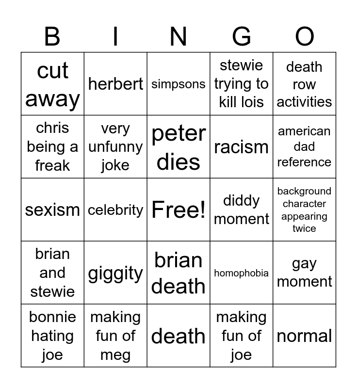 This bingo card has a free space and 24 words: giggity, making fun of meg, peter dies, bonnie hating joe, death row activities, cut away, chris being a freak, herbert, diddy moment, brian death, racism, sexism, homophobia, gay moment, very unfunny joke, making fun of joe, background character appearing twice, simpsons, american dad reference, celebrity, normal, brian and stewie, stewie trying to kill lois and death.