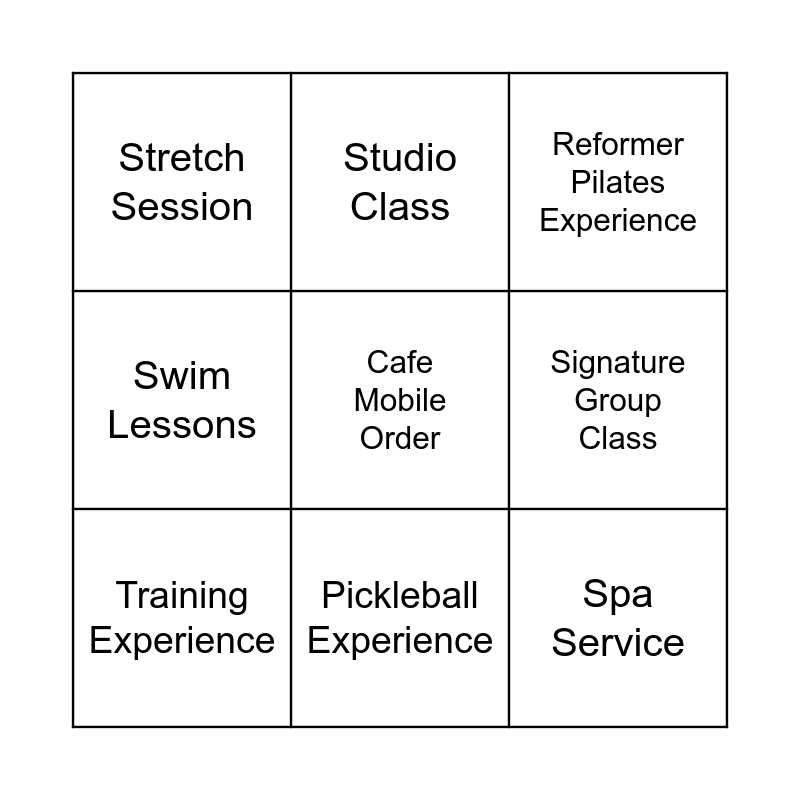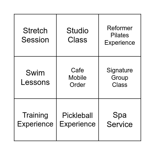 This bingo card has a free space and 8 words: Signature Group Class, Reformer Pilates Experience, Studio Class, Training Experience, Stretch Session, Spa Service, Swim Lessons and Pickleball Experience.