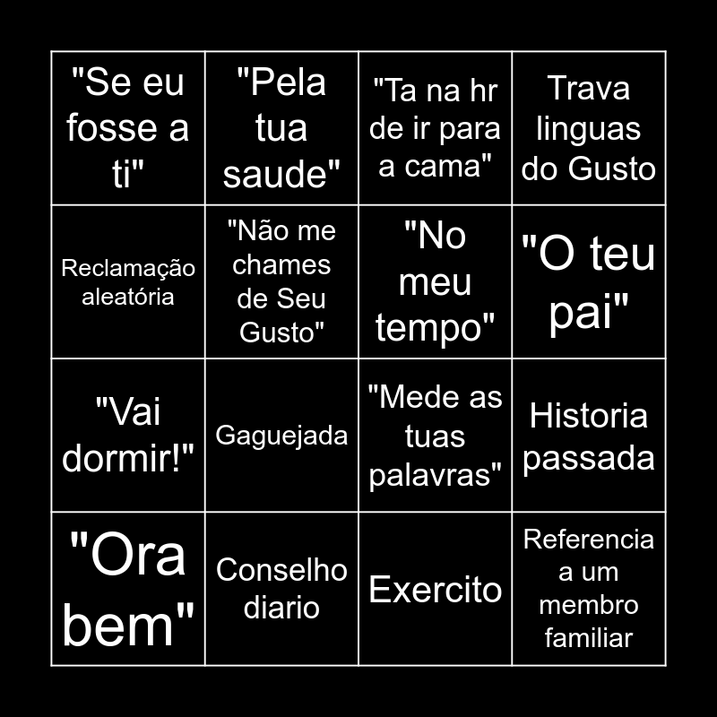 This bingo card has 16 words: Conselho diario, Historia passada, "Ta na hr de ir para a cama", "Se eu fosse a ti", "Vai dormir!", "Pela tua saude", "Mede as tuas palavras", Exercito, Reclamação aleatória, "Não me chames de Seu Gusto", "Ora bem", Trava linguas do Gusto, Gaguejada, "O teu pai", "No meu tempo" and Referencia a um membro familiar.