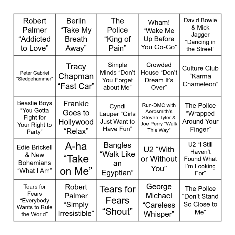 This bingo card has 25 words: A-ha “Take on Me”, Tears for Fears “Shout”, Simple Minds “Don’t You Forget about Me”, Tears for Fears “Everybody Wants to Rule the World”, David Bowie & Mick Jagger “Dancing in the Street”, Robert Palmer “Addicted to Love”, Peter Gabriel “Sledgehammer”, Berlin “Take My Breath Away”, Run-DMC with Aerosmith’s Steven Tyler & Joe Perry “Walk This Way”, Bangles “Walk Like an Egyptian”, Crowded House “Don’t Dream It’s Over”, Beastie Boys “You Gotta Fight for Your Right to Party”, U2 “With or Without You”, U2 “I Still Haven’t Found What I’m Looking For”, Tracy Chapman “Fast Car”, The Police “Don’t Stand So Close to Me”, The Police “Wrapped Around Your Finger”, The Police “King of Pain”, Culture Club “Karma Chameleon”, Frankie Goes to Hollywood “Relax”, Cyndi Lauper “Girls Just Want to Have Fun”, Robert Palmer “Simply Irresistible”, Edie Brickell & New Bohemians “What I Am”, Wham! “Wake Me Up Before You Go-Go” and George Michael “Careless Whisper”.